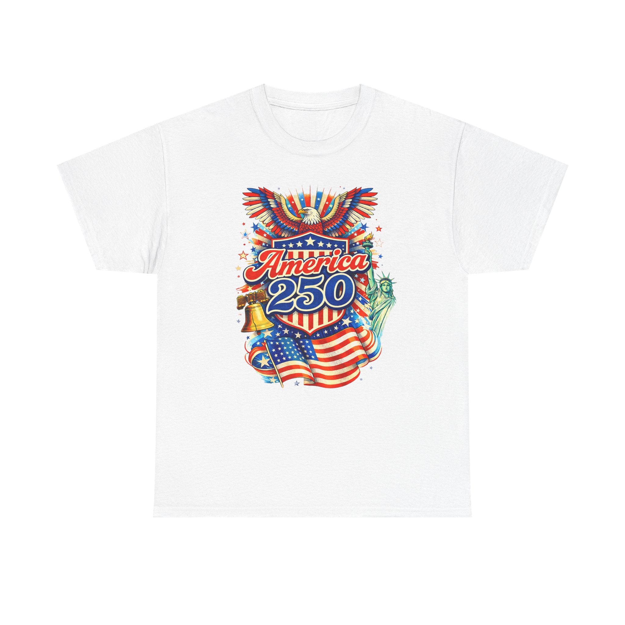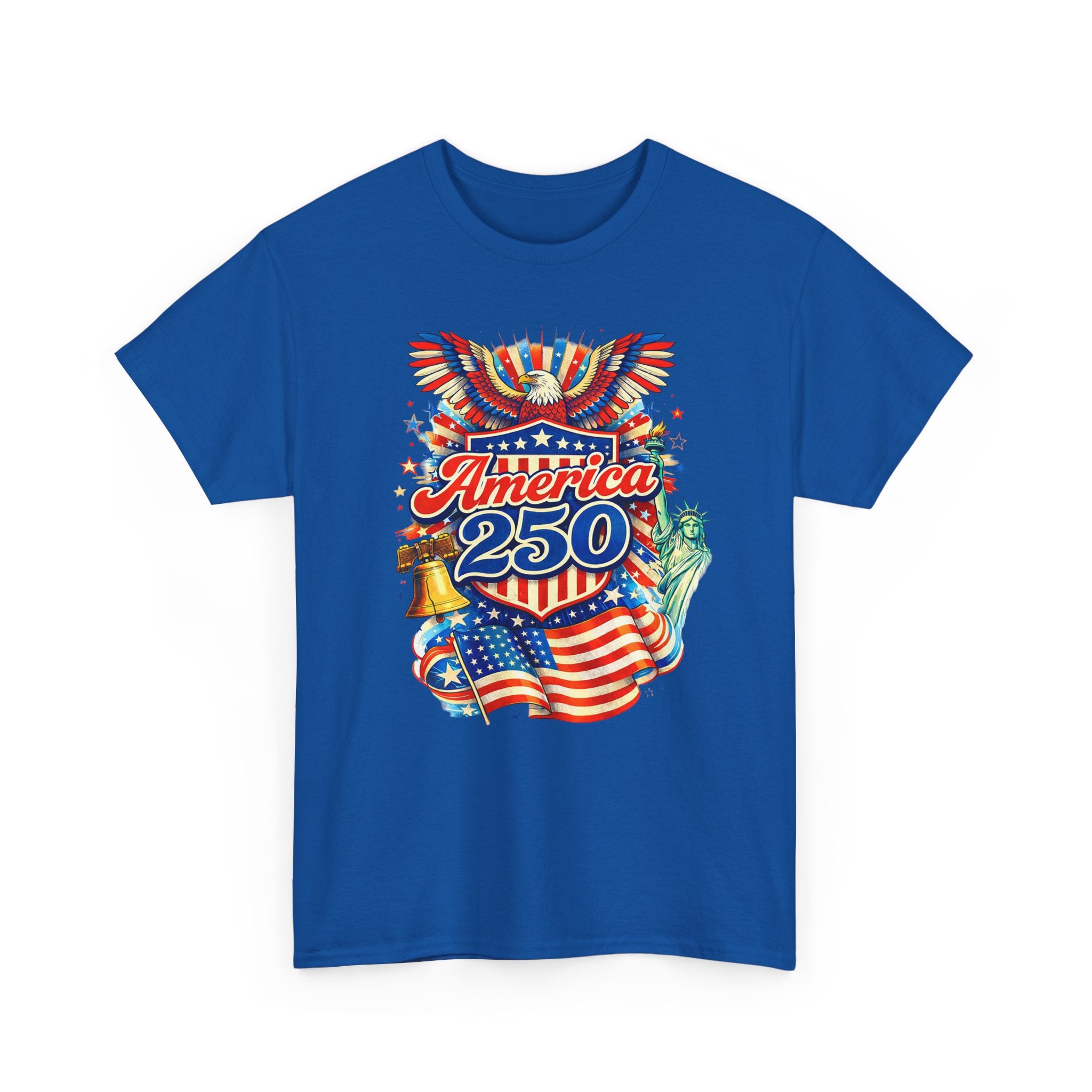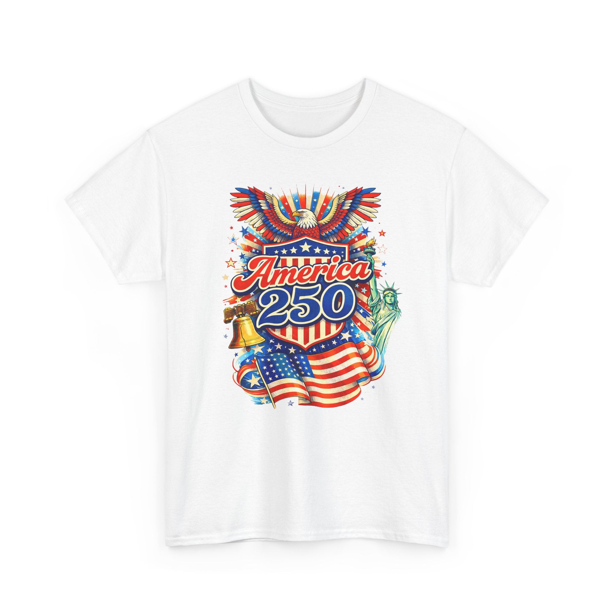 A lively, nostalgic tee that celebrates American pride with a colorful, retro-style graphic. The front features a bold montage—Stars and Stripes waving, a ringing Liberty Bell, the Statue of Liberty’s torch, and “America 250” in vibrant lettering—rendered with vintage poster energy. It feels like standing at a summer parade: sun-warmed pavement, sparklers in hand, and community gathered around block parties and fireworks. Lightweight yet sturdy, this shirt moves easily from backyard BBQs and local festivals to casual city strolls. Wear it to mark national moments or to carry a little patriotic sparkle into everyday life.
