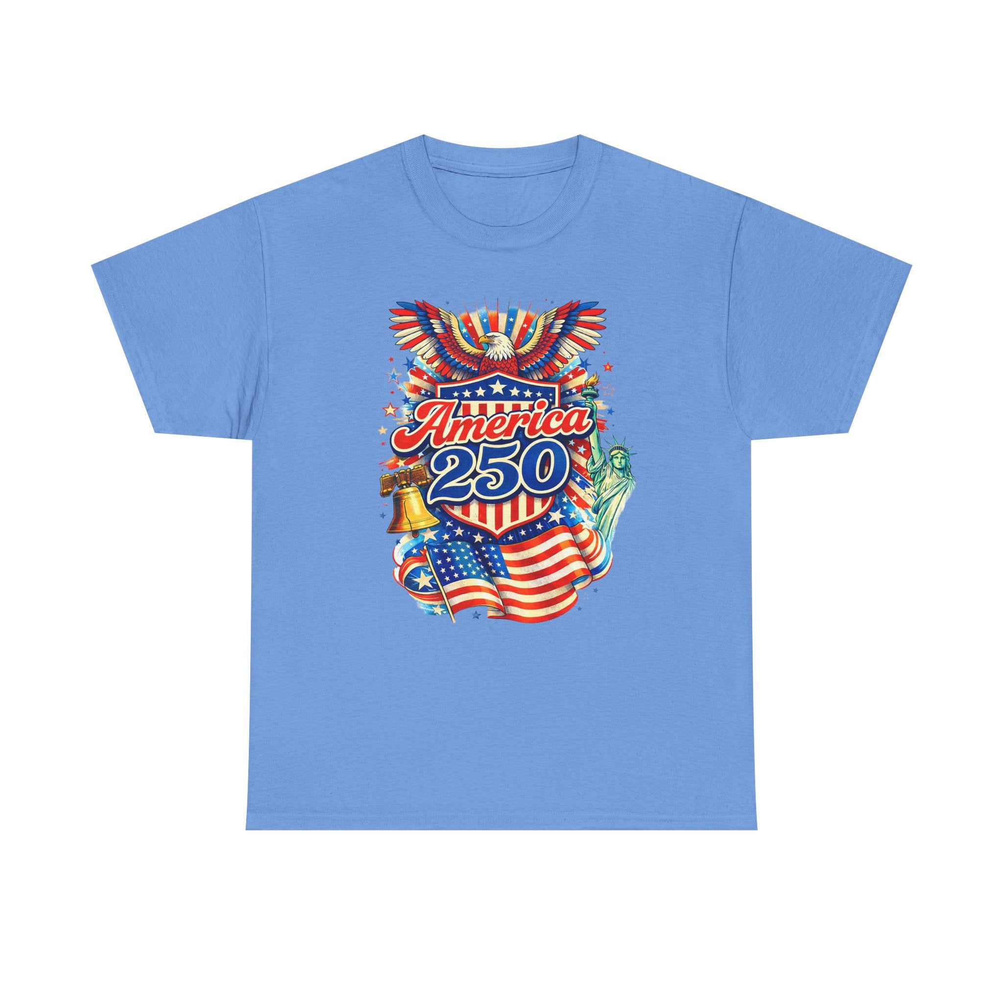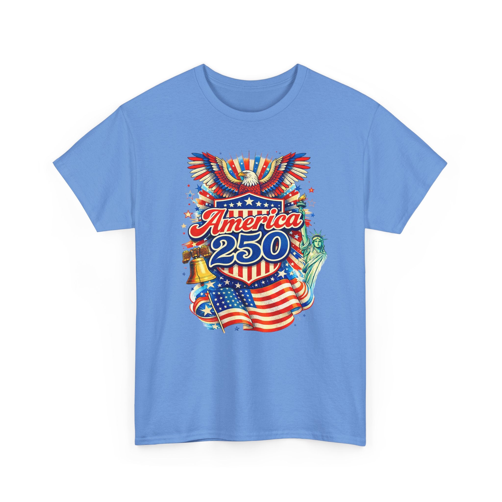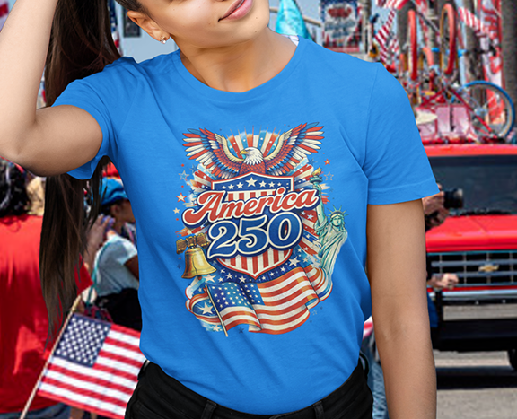 A lively, nostalgic tee that celebrates American pride with a colorful, retro-style graphic. The front features a bold montage—Stars and Stripes waving, a ringing Liberty Bell, the Statue of Liberty’s torch, and “America 250” in vibrant lettering—rendered with vintage poster energy. It feels like standing at a summer parade: sun-warmed pavement, sparklers in hand, and community gathered around block parties and fireworks. Lightweight yet sturdy, this shirt moves easily from backyard BBQs and local festivals to casual city strolls. Wear it to mark national moments or to carry a little patriotic sparkle into everyday life.