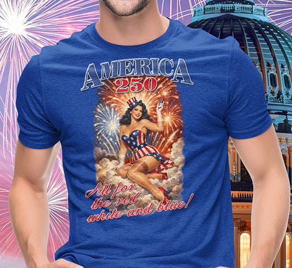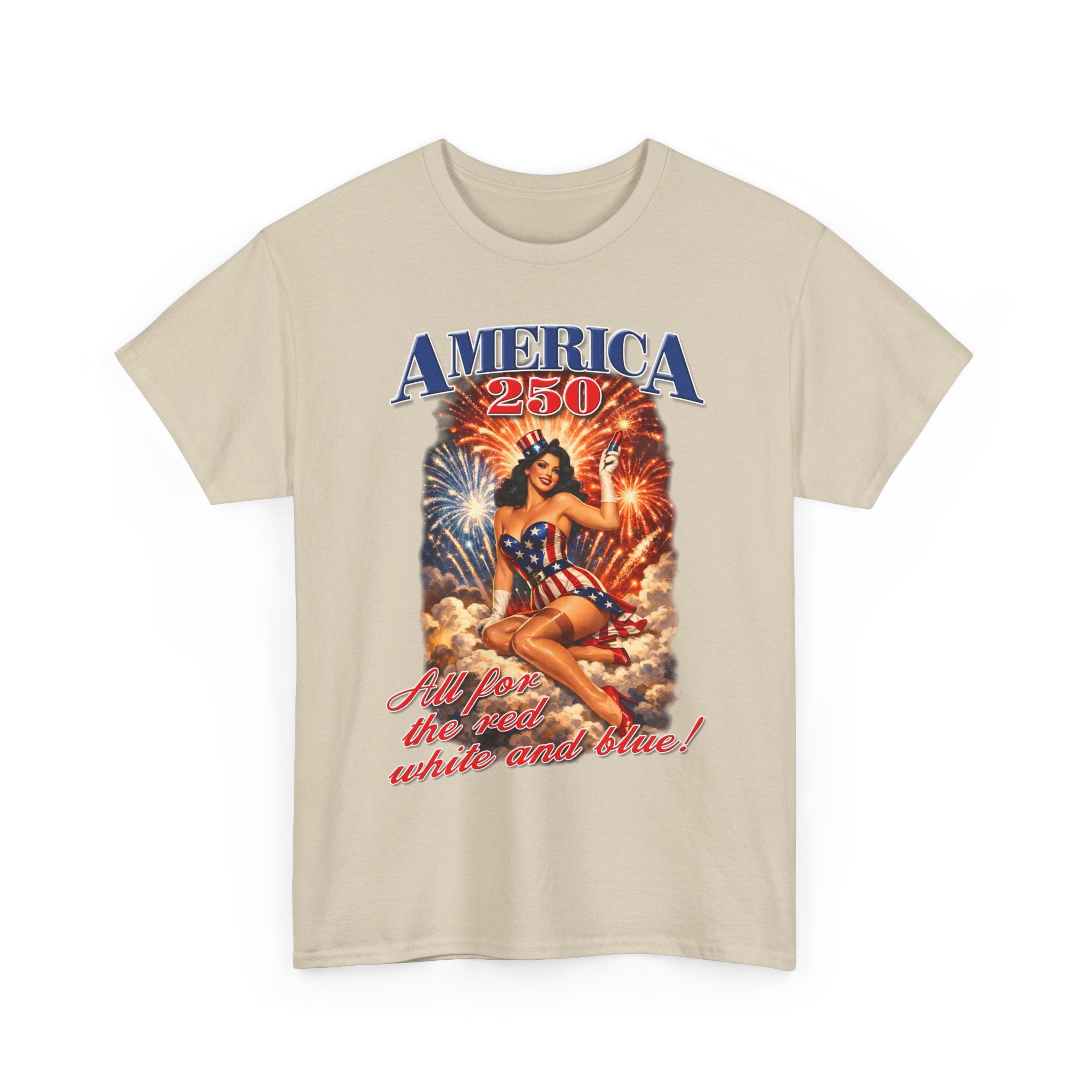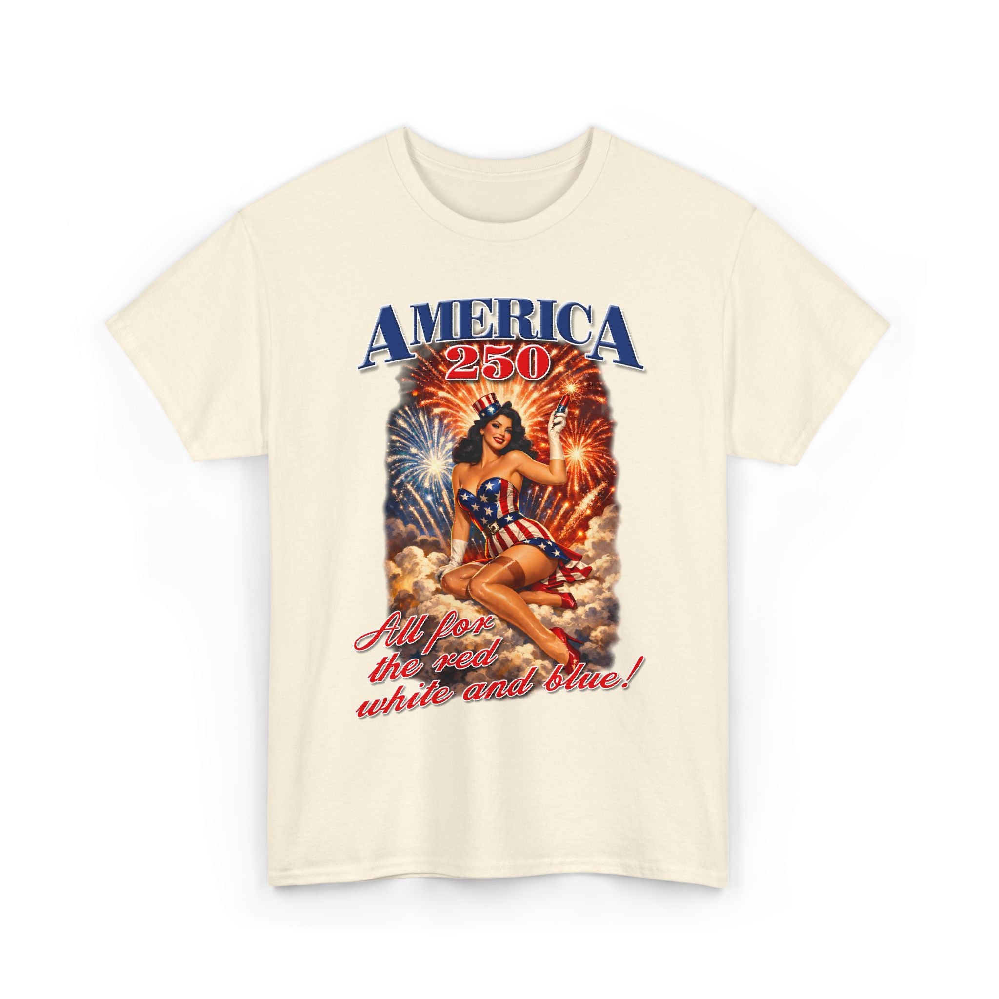 This vintage-inspired tee brings a sunny, nostalgic Fourth of July energy to your wardrobe. The front art features a pin-up style figure draped in flags, set against bursting fireworks and warm, sunset tones—an emblem of retro Americana. The shirt’s relaxed classic fit and smooth, sturdy cotton keep the feel casual and comfortable while showcasing the detailed, vibrant print. Wear it to backyard barbecues, local parades, or nights by the river when you want that worn-in, celebratory look with durable construction that holds up wash after wash.