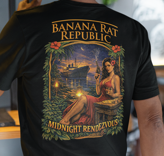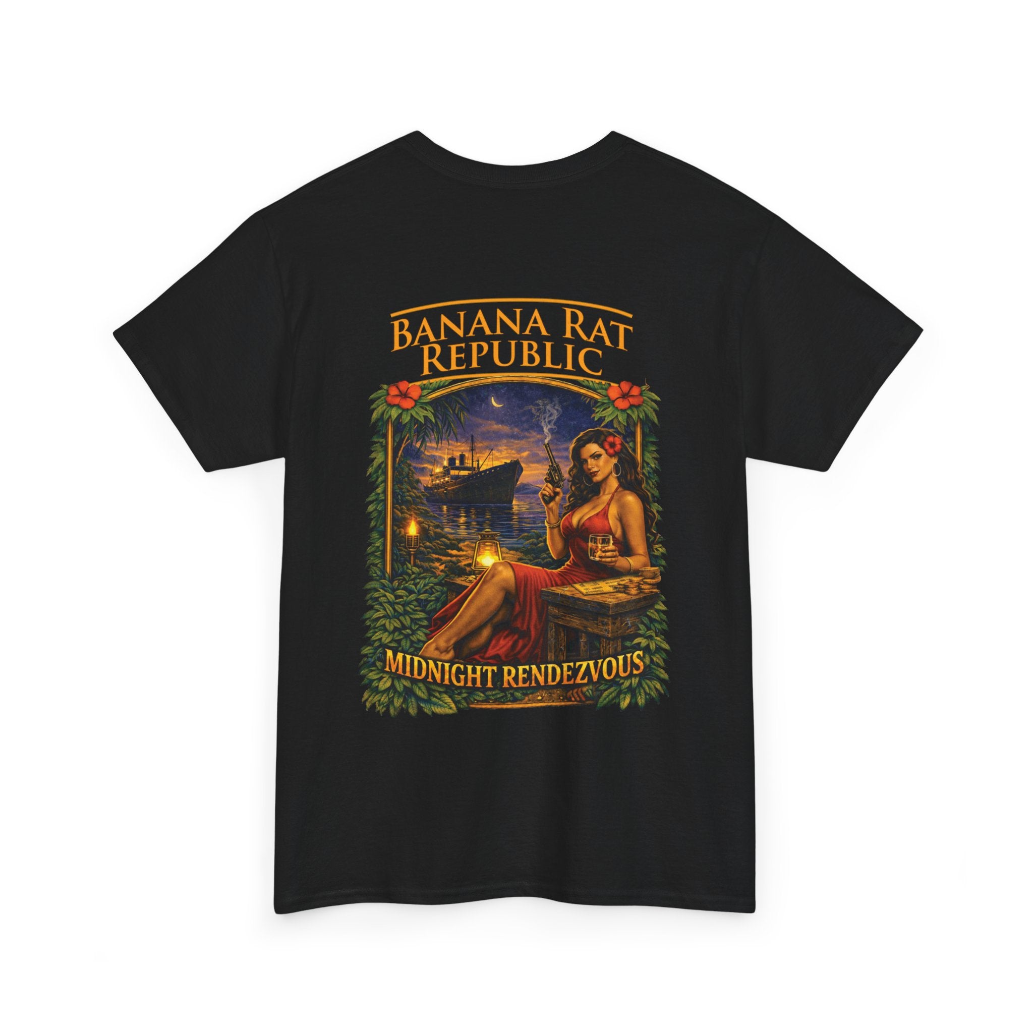 This relaxed crewneck tee brings vintage tiki-bar vibes to everyday wear. The front features a small, worn-patina crest while the back blooms into a sunset-soaked scene: a retro, island-night illustration framed with lush foliage and the playful title “Banana Rat Republic — Midnight Rendezvous.” The colors—warm golds, deep greens and sunset oranges—feel hand-printed and slightly aged, giving the shirt a lived-in, road-trip memory quality. It sits loose across the shoulders and hangs comfortably at the hip, so it layers under jackets or stands out on its own. Wear it for bonfire nights, vinyl-hunting afternoons, or when you want to conjure a slow, tropical evening without leaving town.
