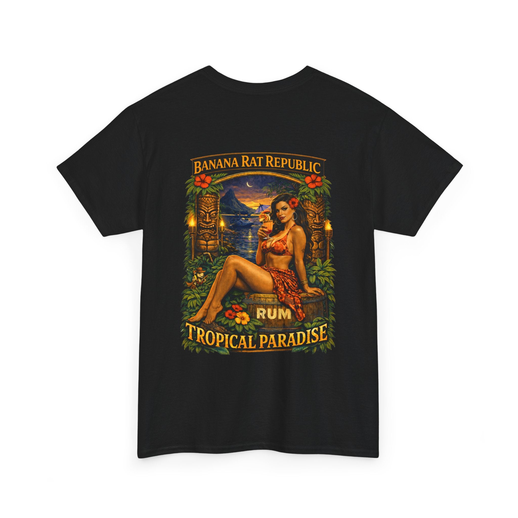 A laid-back, vintage-inspired tee that channels warm nights and salty air. The front carries a small crest-style motif; the back bursts with a sunset scene — tiki torches, lush foliage, and a relaxed pin-up figure framed by the words “Banana Rat Republic” and “Tropical Paradise.” It feels like a passport stamp from a rum-soaked island bar: sun-washed colors, slightly weathered printing, and a comfortable, roomy silhouette that invites you to unwind. Wear it to wander coastal streets, linger at beach bonfires, or bring a slice of island calm to everyday life.