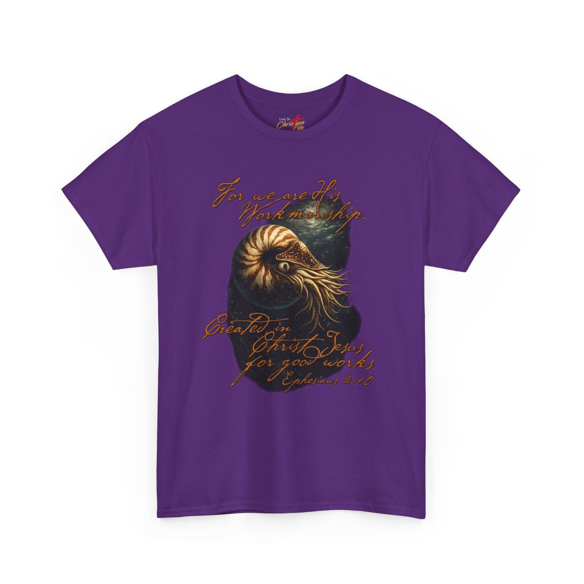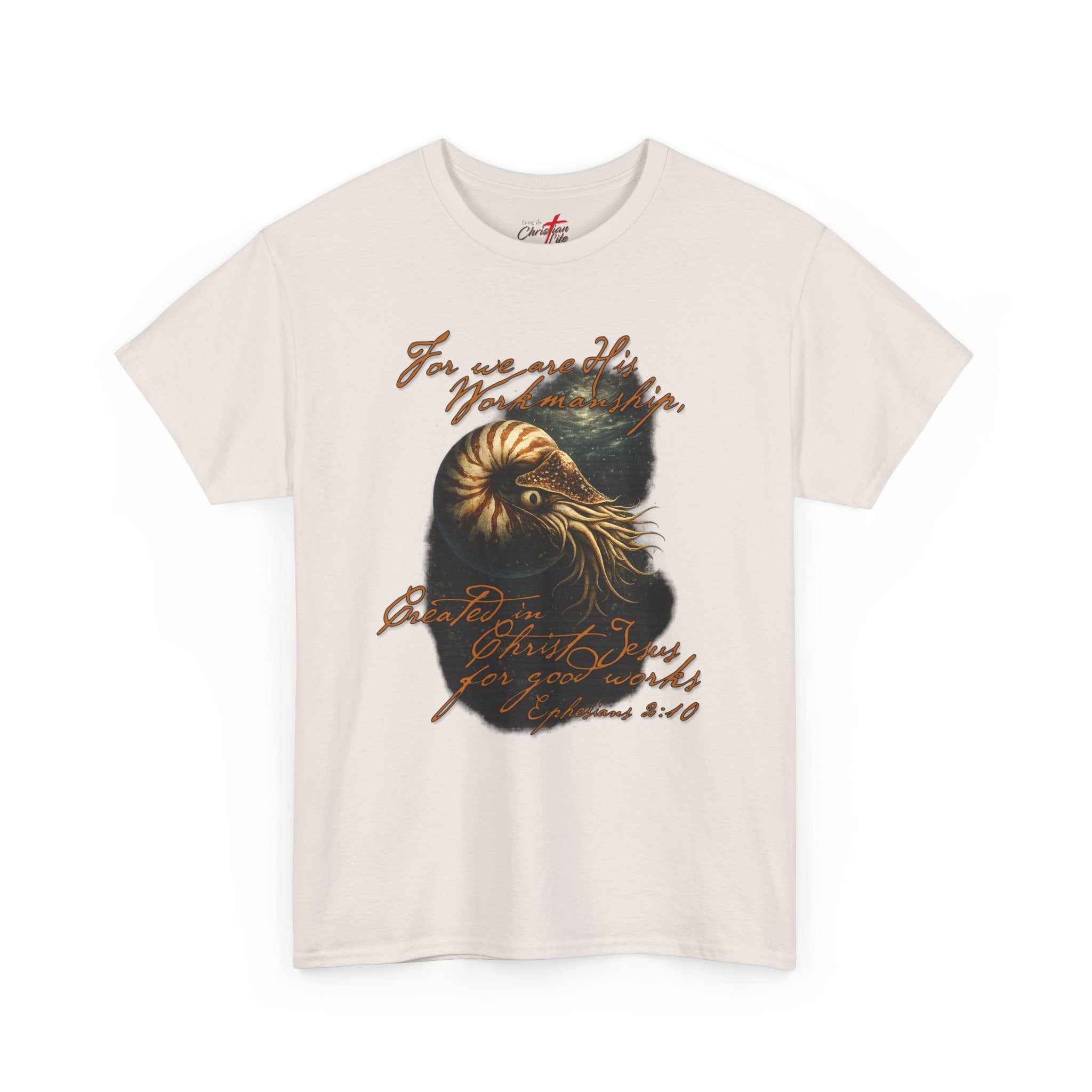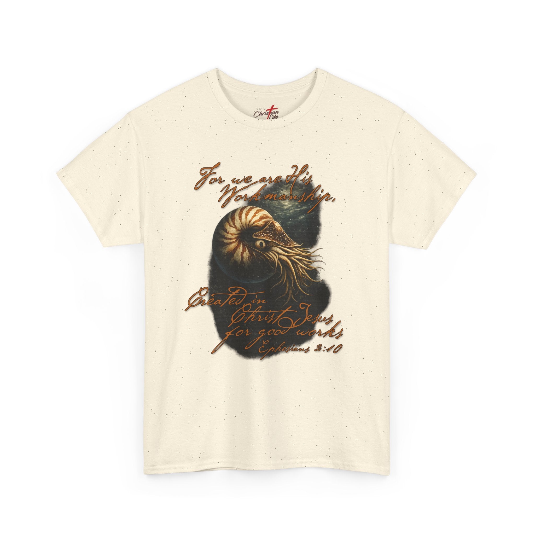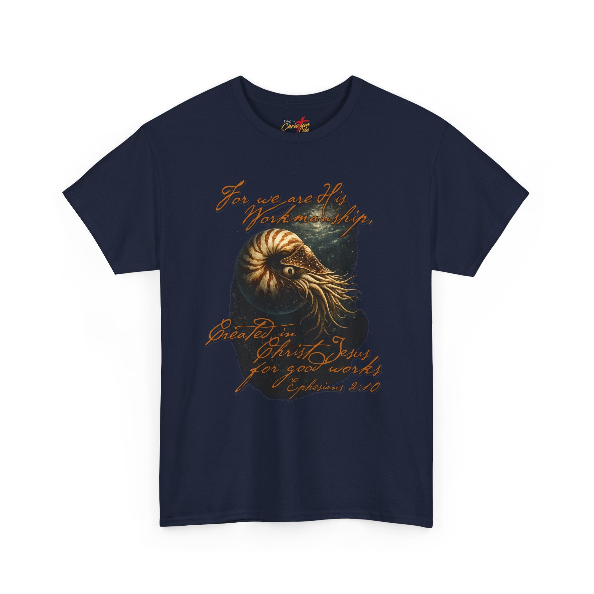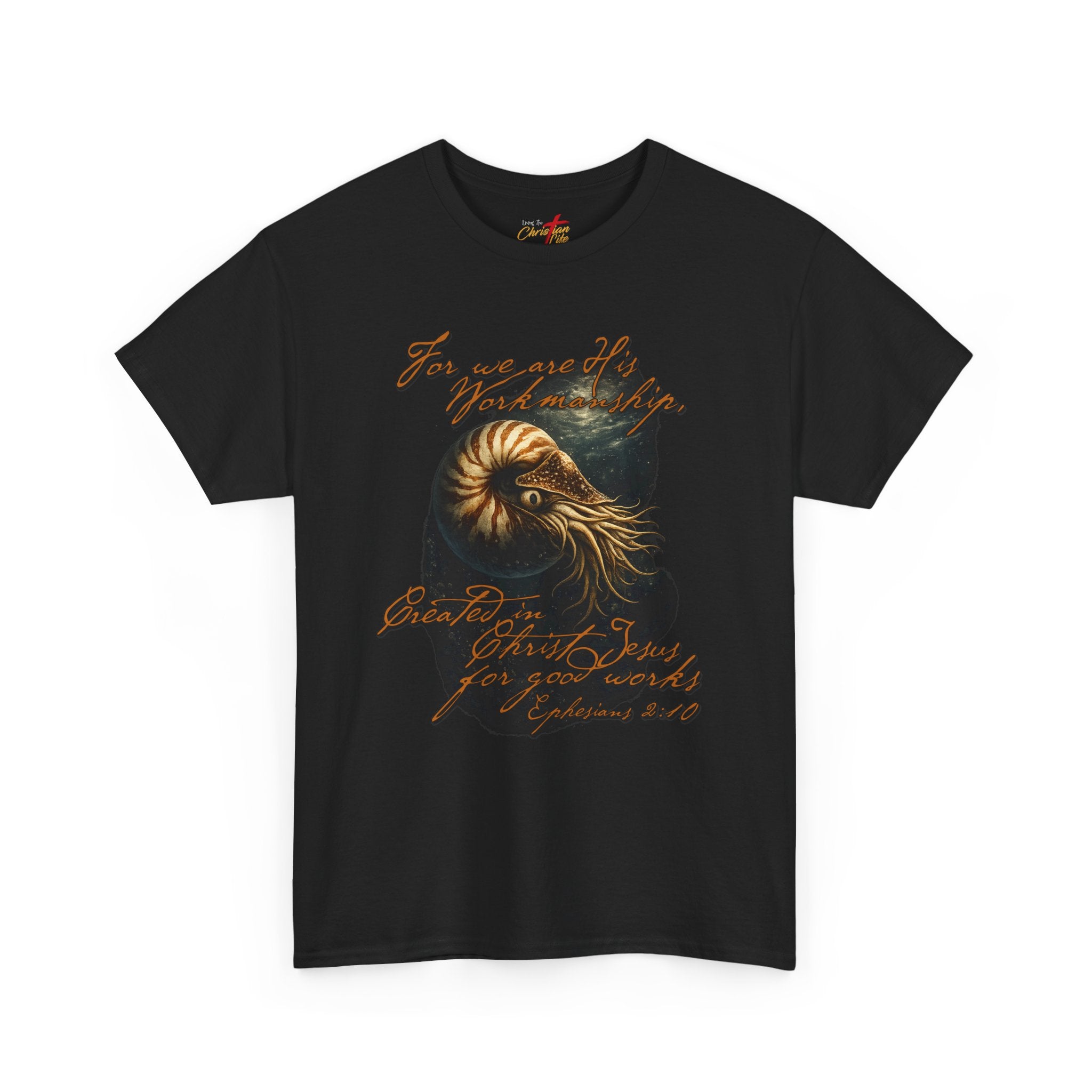 This classic cotton tee carries a quietly adventurous spirit. A richly detailed nautilus illustration—rendered in warm golds and deep teal—sits against the black fabric like a fossilized memory. Faded, handwritten script of scripture weaves around the shell, giving the shirt an artful, found-object vibe that reads like a note from a long seaside wander. It wears like a reliable layer: relaxed through the body, soft on the skin, and built to hold its shape through repeat wear. Someone who lives for coastal walks, record-store afternoons, or late-night sketch sessions will find this tee slips effortlessly into those moments and helps tell their story without saying too much.
