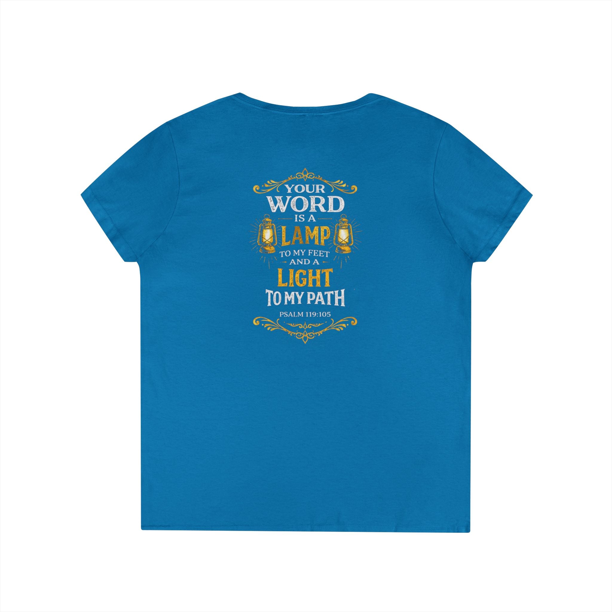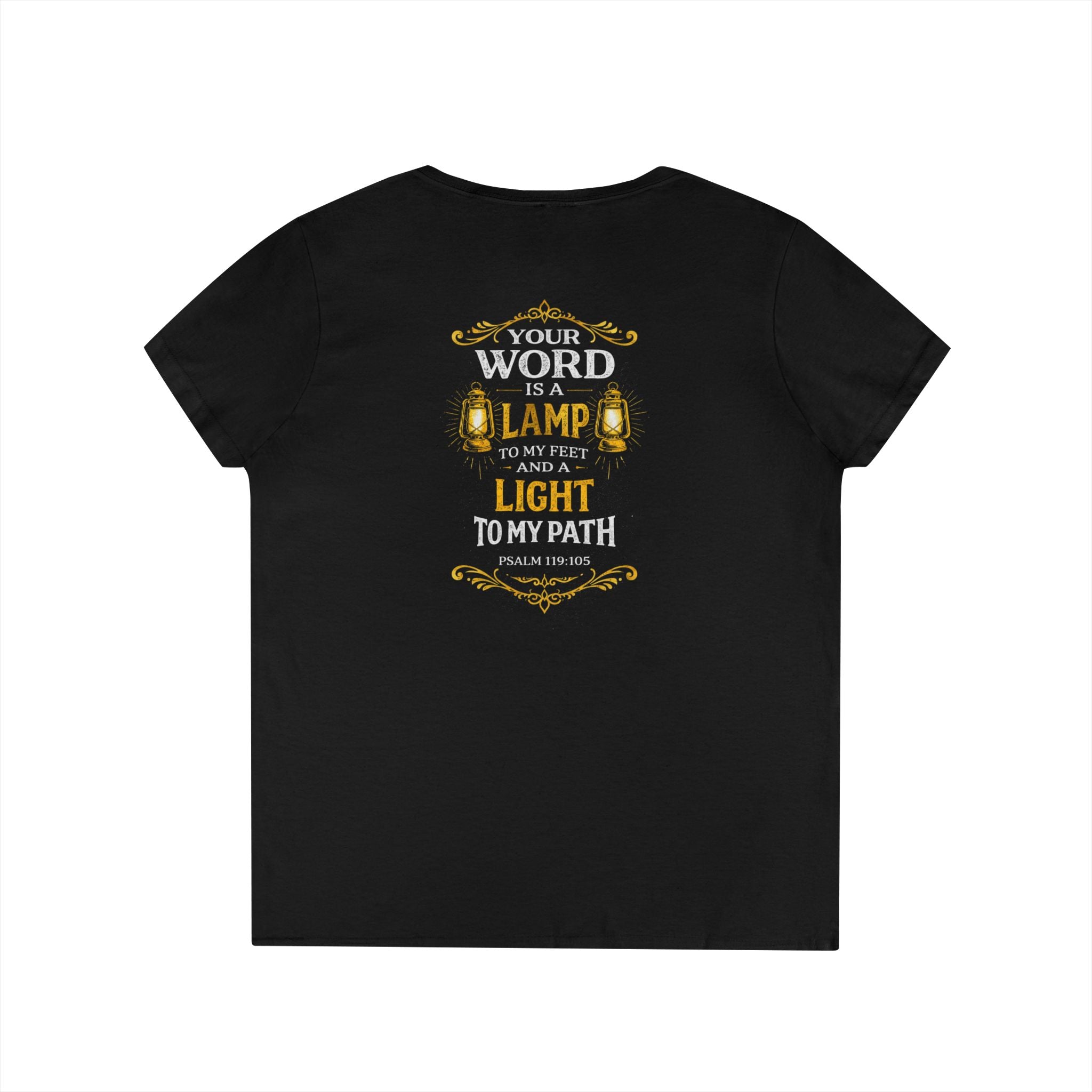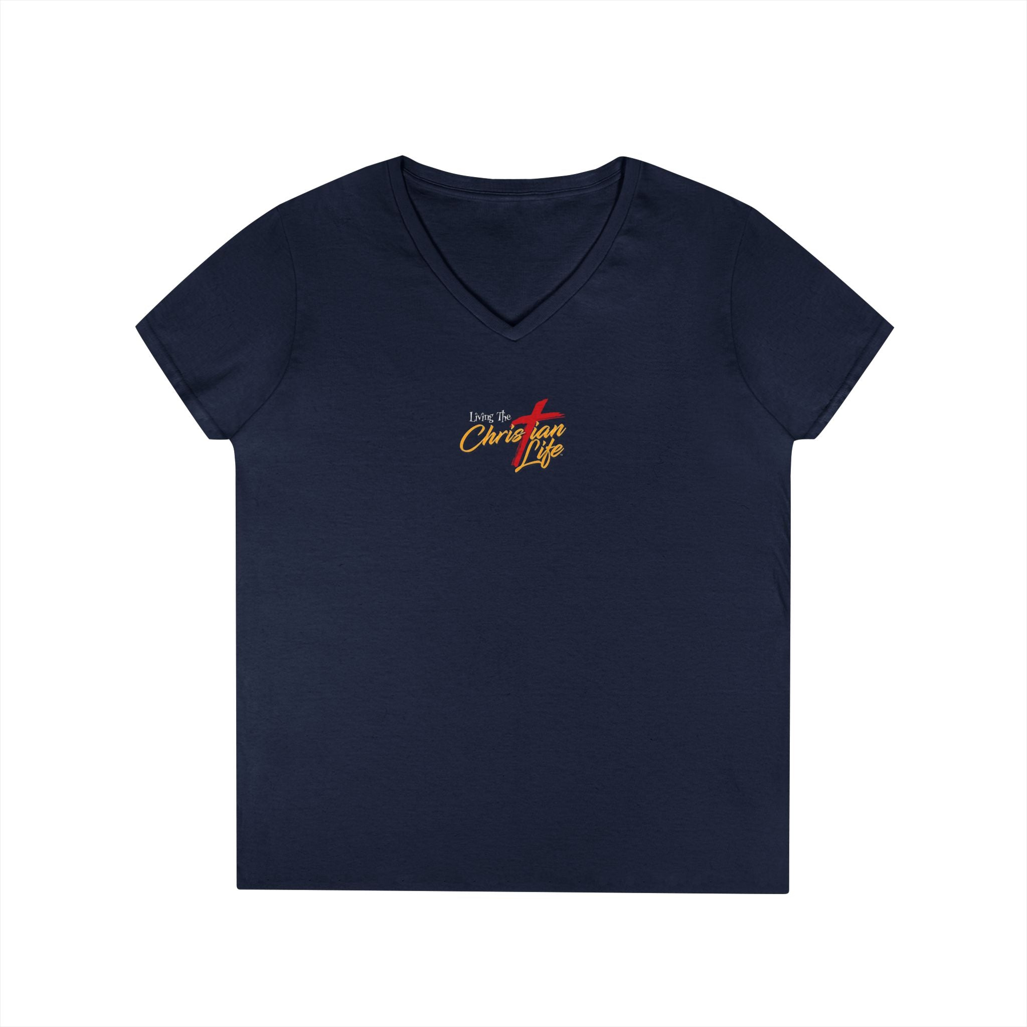 This soft, semi-fitted V-neck feels like a quiet pledge you can wear. The front keeps things subtle with a small, warm emblem over the heart; the back opens into a bold, vintage-inspired scripture design that reads like a lantern for the day. Lightweight yet sturdy cotton drapes comfortably while the ribbed collar and taped shoulders hold the shape wash after wash. Slip it on for morning devotion, community gatherings, or a reflective walk — it moves from hush to statement without shouting. The tear-away label keeps the neckline clean and comfortable, so nothing distracts from the message you carry.