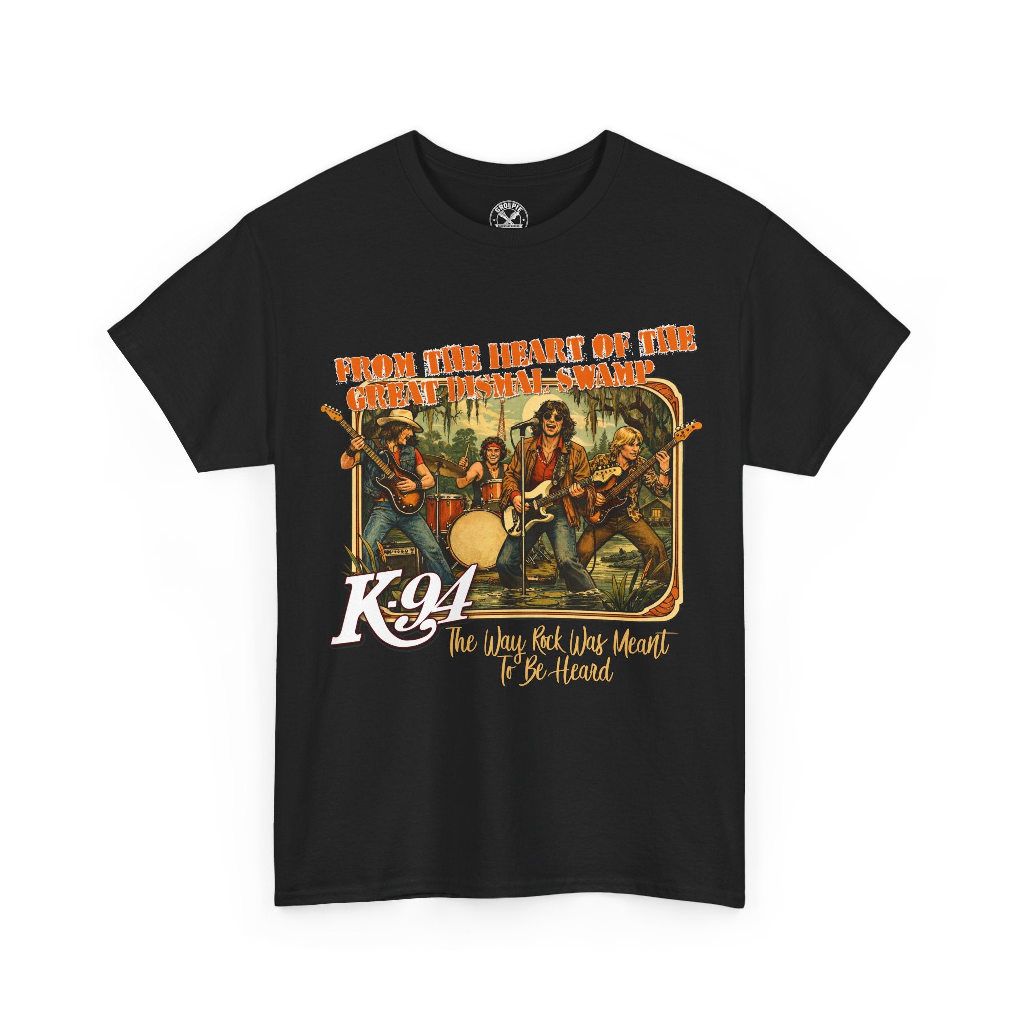 This classic crew-neck tee features a vintage-inspired band scene with warm, worn-in colors that feel lived-in and true to the road. This design is an homage to the greatest radio station of the 70's rock era. It sits relaxed across the shoulders and falls straight through the body, so it layers easily under jackets or stands alone with jeans. The cotton fabric gives a smooth canvas for the detailed print while the ribbed collar and taped shoulders hold shape after washes. Wear it to shows, late-night drives, or while tuning up your rig — it carries that rustic, backstage energy without fuss.