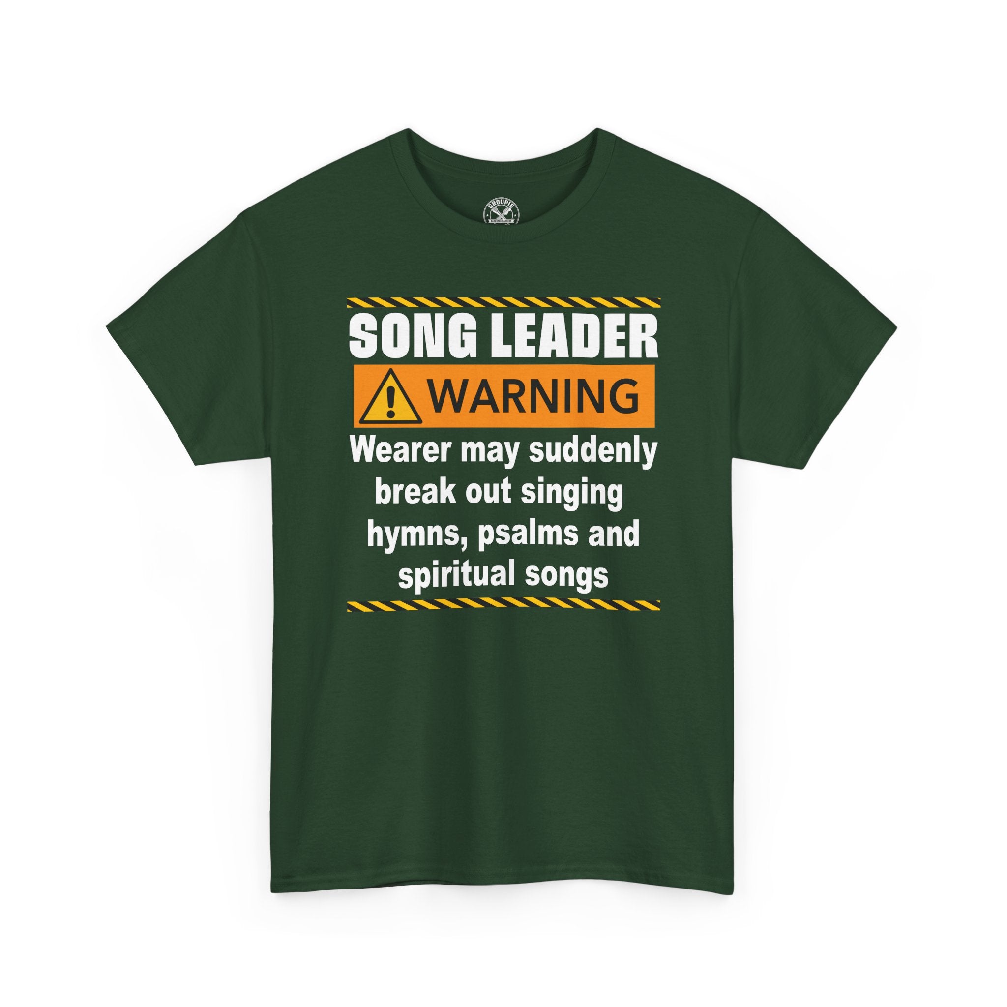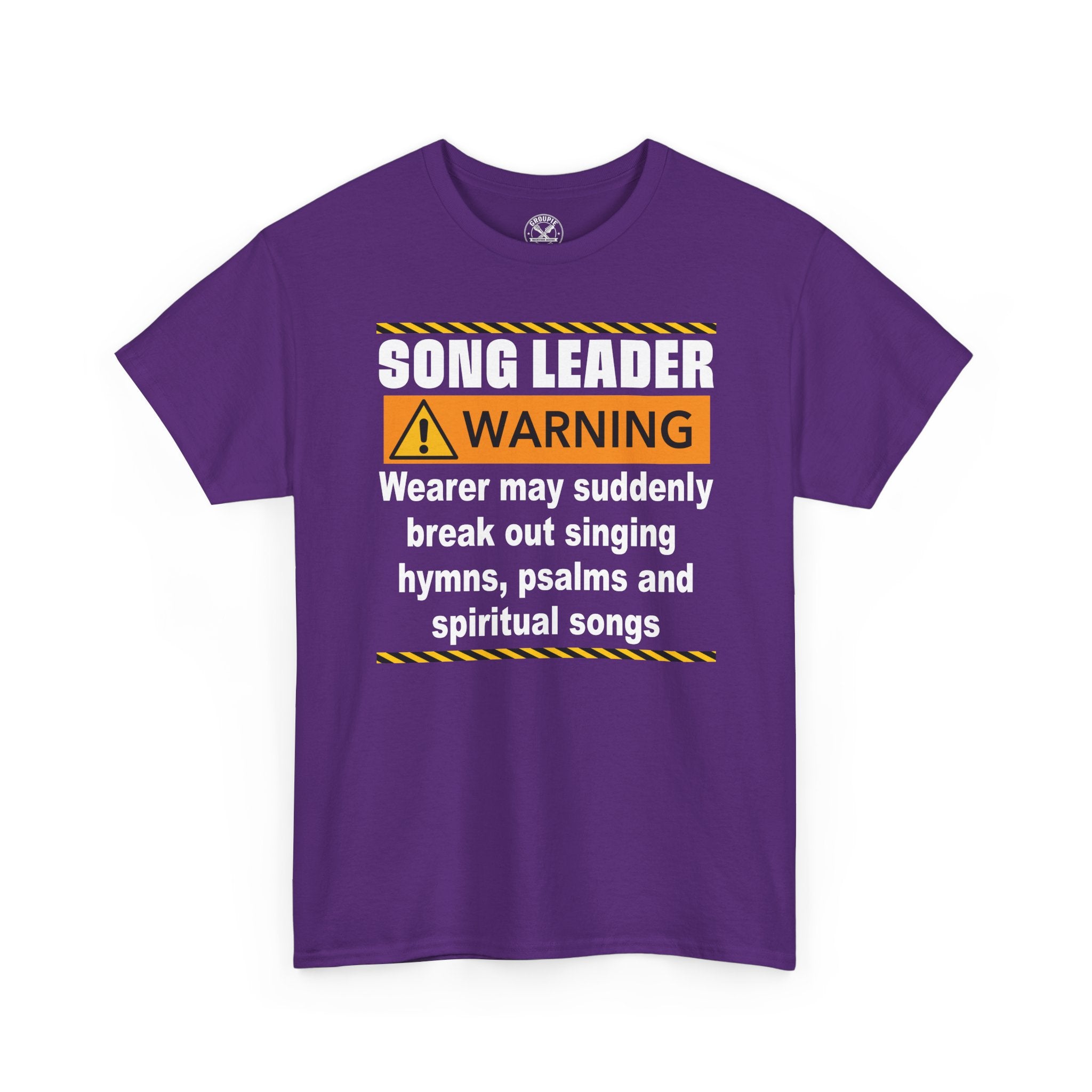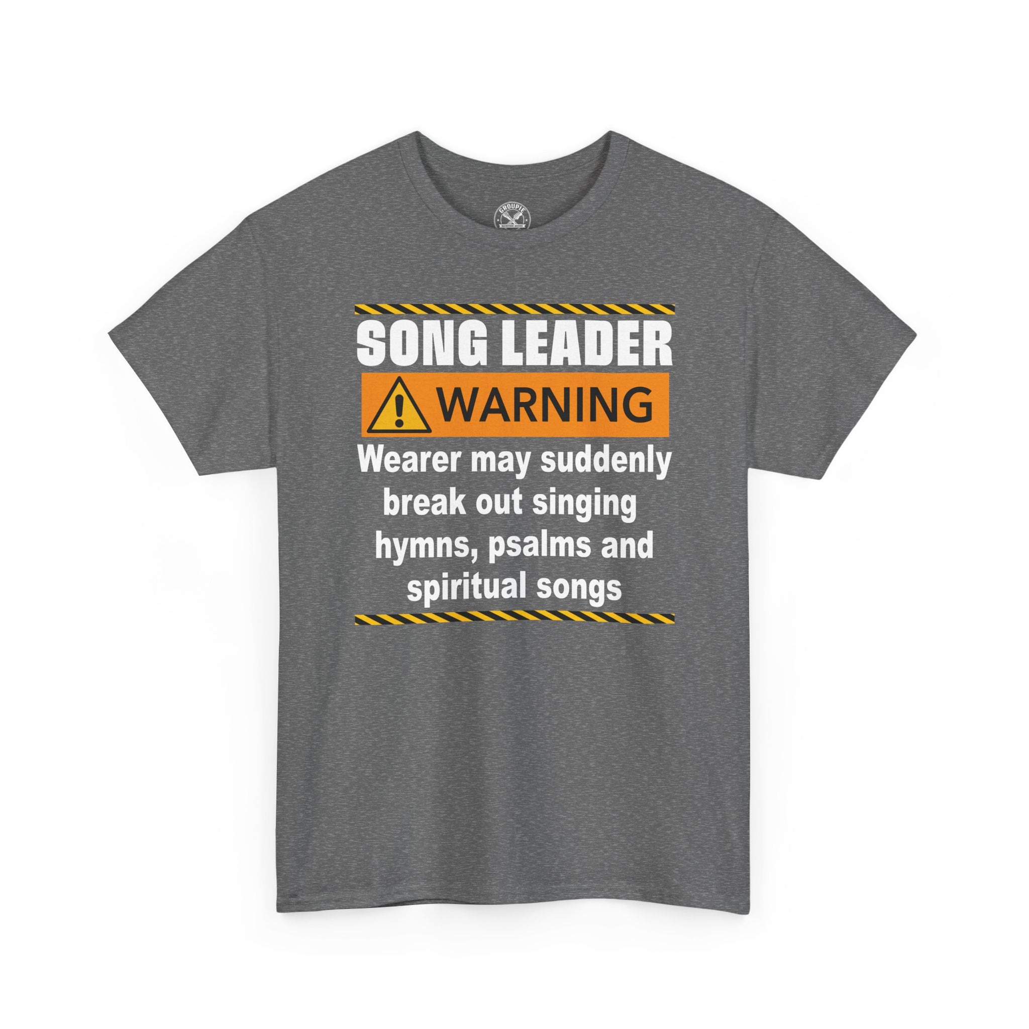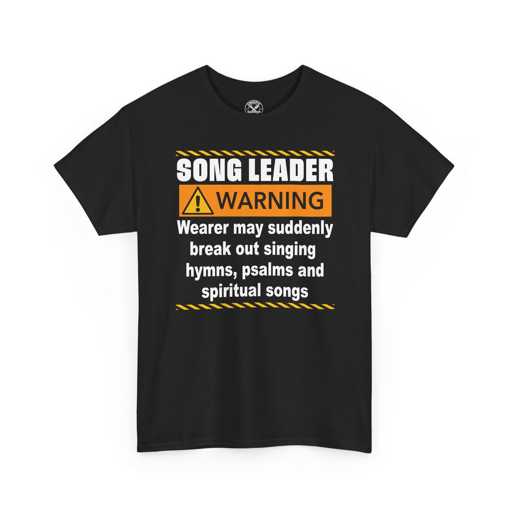 This classic crewneck tee carries a playful, church-choir vibe made for the person who leads worship and isn’t shy about it. Bold warning-style graphics — high-contrast text, caution stripes, and an alert icon — announce “SONG LEADER WARNING” and the humorous line about bursting into hymns, psalms, and spiritual songs. The black fabric makes the print pop and keeps the look grounded and versatile. Wear it to rehearsals, casual services, choir socials, or while running errands to spark smiles and start conversations. The relaxed fit and soft cotton make it comfortable for long practice sessions, while the durable print methods hold up through washes. It reads like an inside joke for church musicians and worship volunteers — confident, warm, and a little irreverent in the best way.