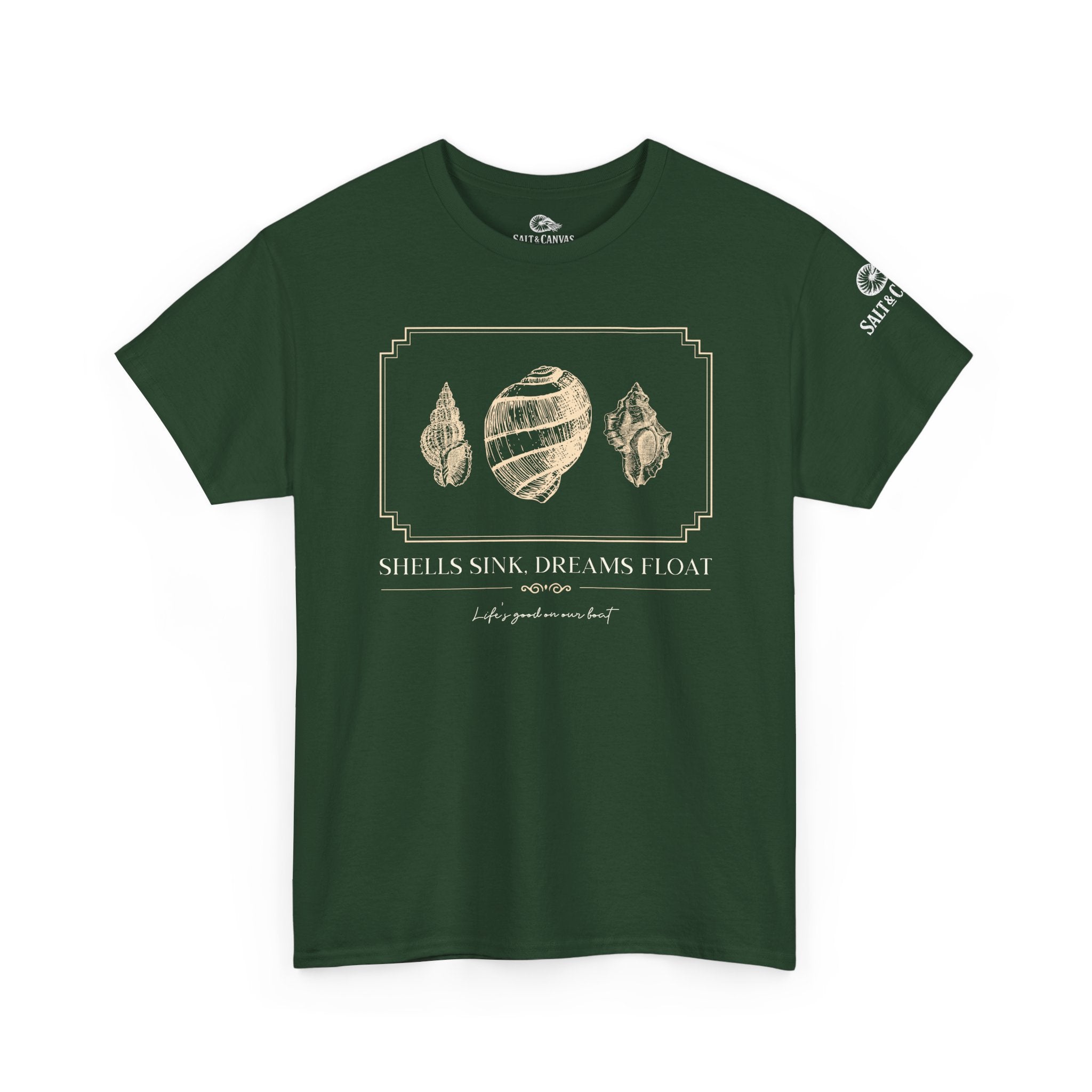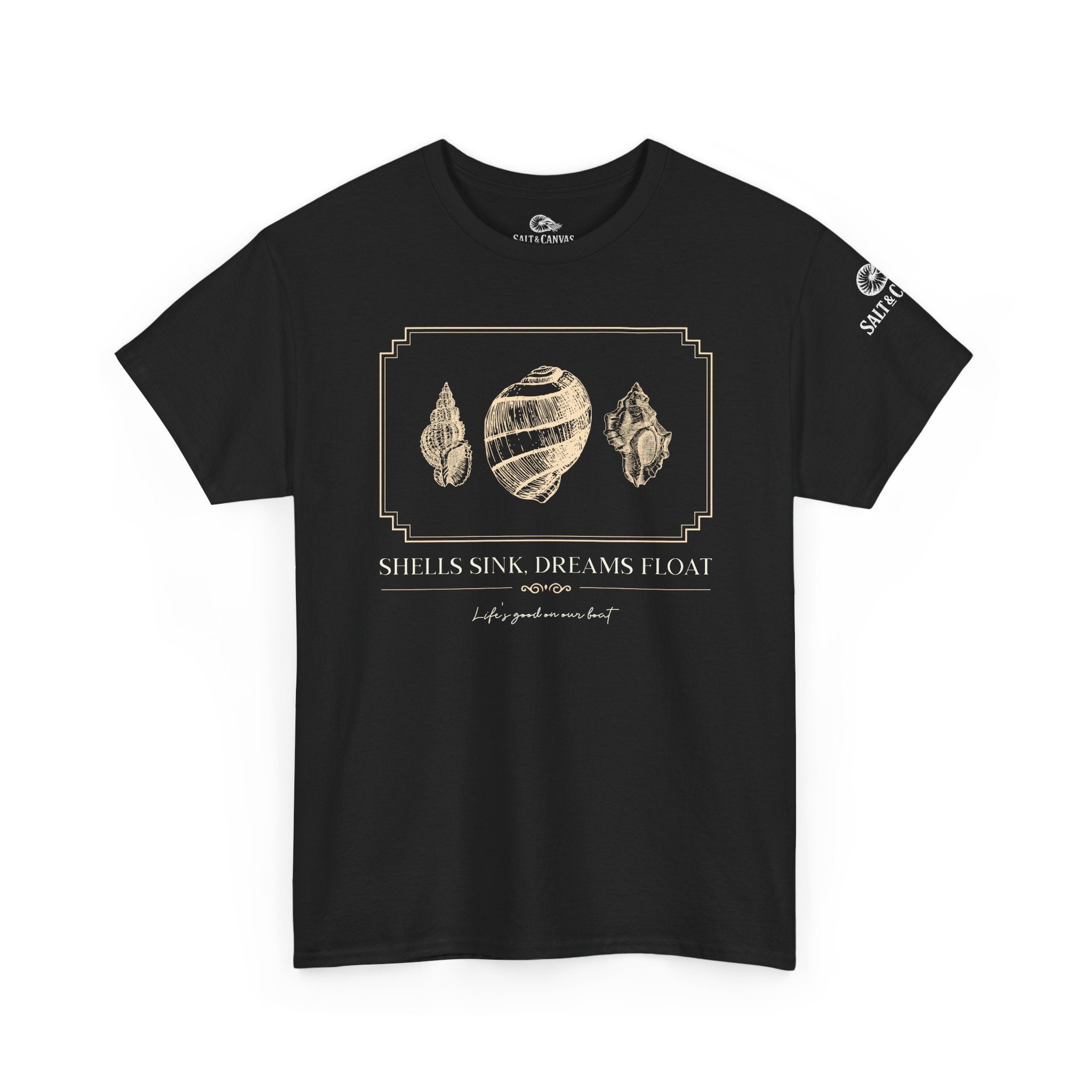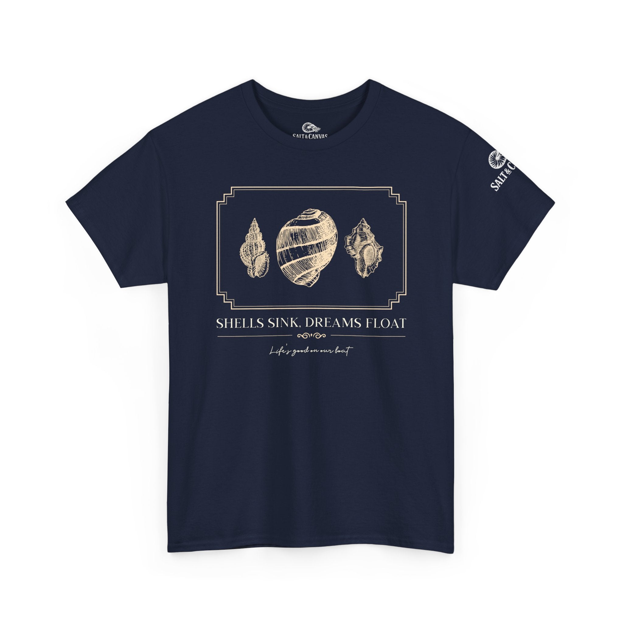 Salt-tinged evenings and the hush of tide pools — this tee carries that coastal calm with a quiet, vintage edge. Three engraved shell illustrations sit inside a softly framed rectangle, like finds pinned to a collector’s board. The headline — "Shells Sink. Dreams Float." — reads like a private mantra beneath the art, and a small sleeve stamp adds an extra handcrafted touch. Wear it when you’re walking the shoreline at dusk, journaling on the porch, or layering under a worn flannel for slow weekend drives. It’s breathable, sturdy, and settles into your rotation like something you’ve always reached for on salty days.