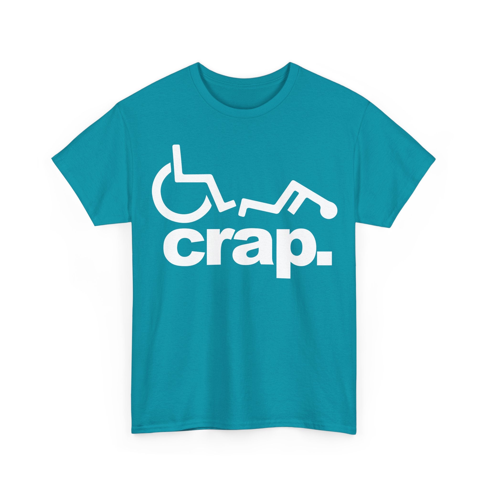 This black cotton tee speaks with blunt humor and quiet defiance. A bold white graphic shows a tipped wheelchair icon paired with the single-word caption “crap.” It’s the kind of shirt that cracks a laugh while acknowledging the messy, frustrating moments of disability life — a wearable exhale for someone who uses gallows humor to get through. The medium-weight fabric holds shape and print detail, while the roomy classic cut and crew neck keep it comfortable all day. Wear it to the clinic, a friend’s house, or out running errands; it reads like an honest, human response rather than sugarcoated optimism. Thoughtful construction — reinforced shoulders, ribbed collar, and a soft tear-away label — keeps the focus on the message, not the tag. Ethically made and safety-certified, this tee pairs well with worn jeans, a favorite jacket, or layered under an open shirt when you want your voice to be straightforward and oddly comforting.