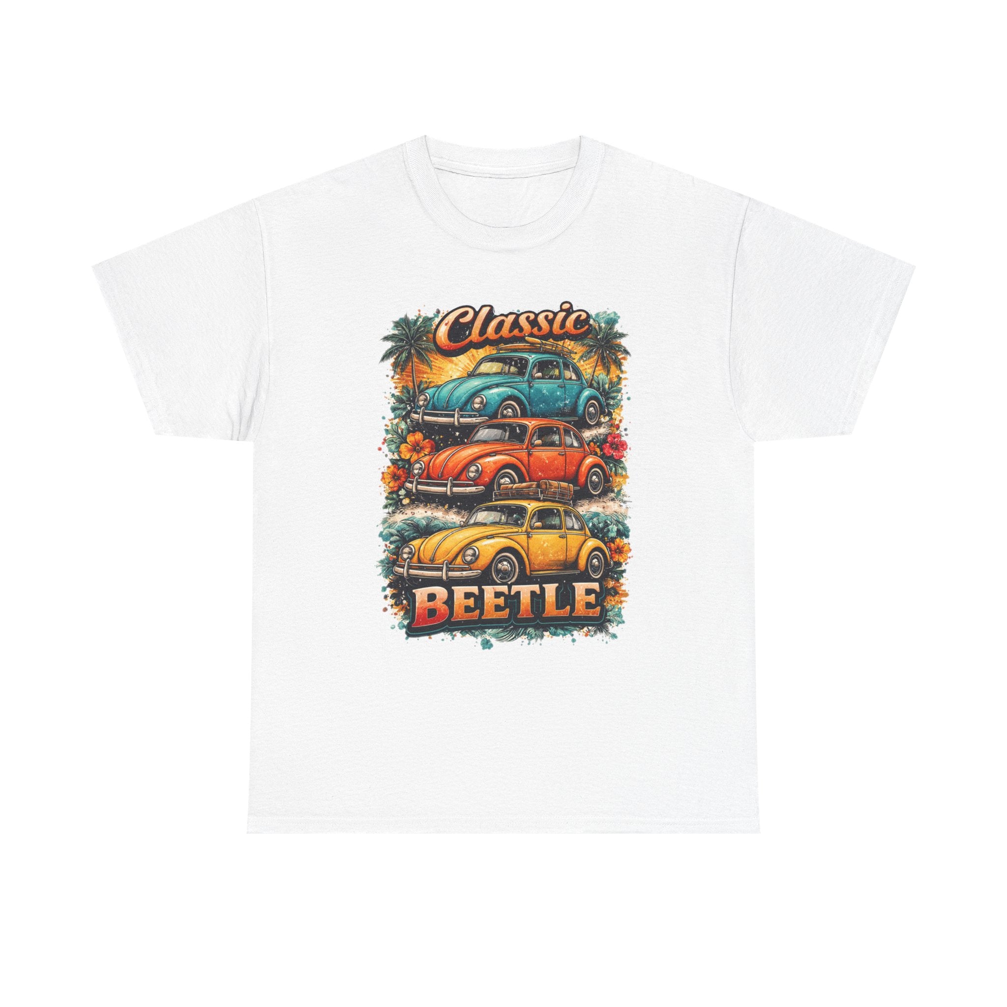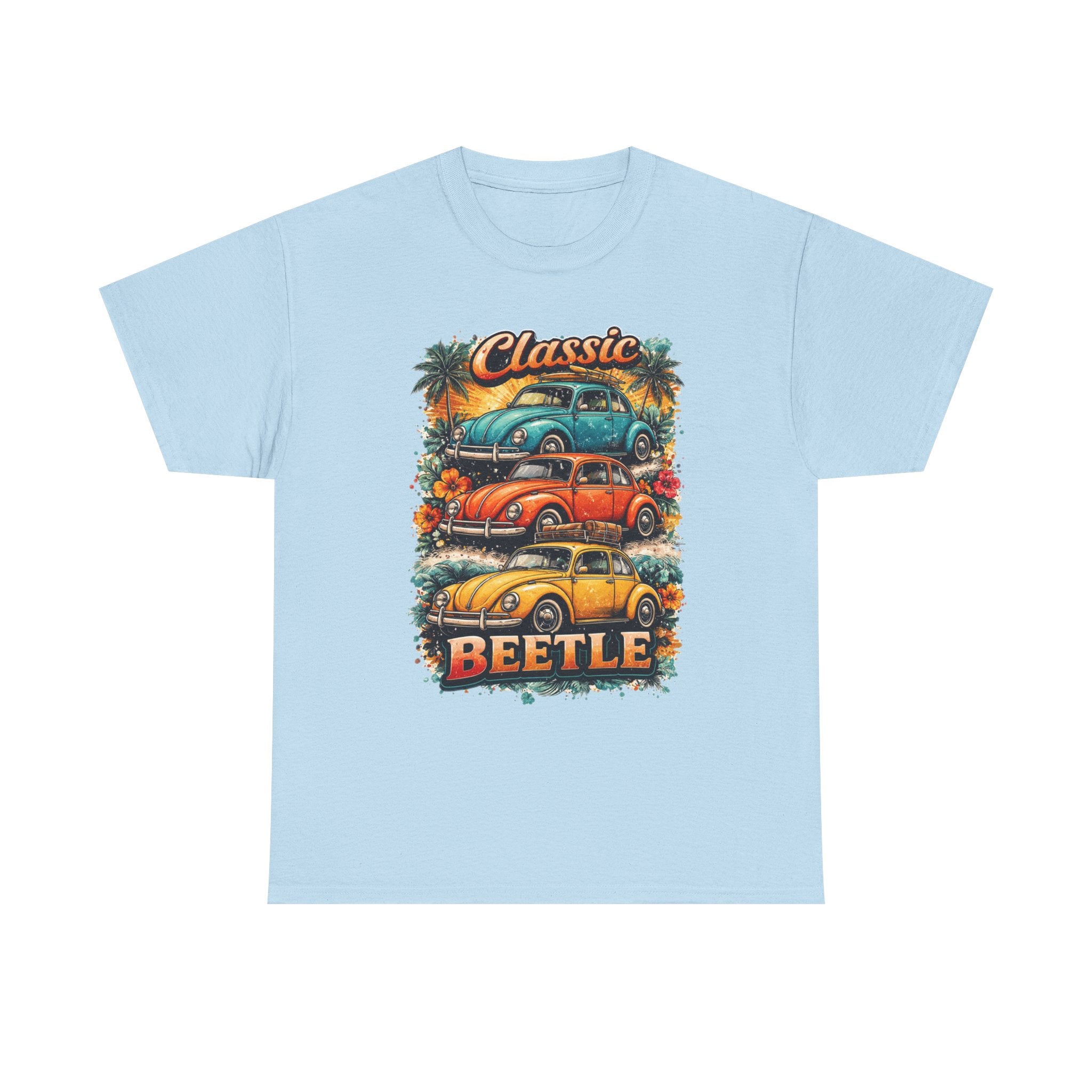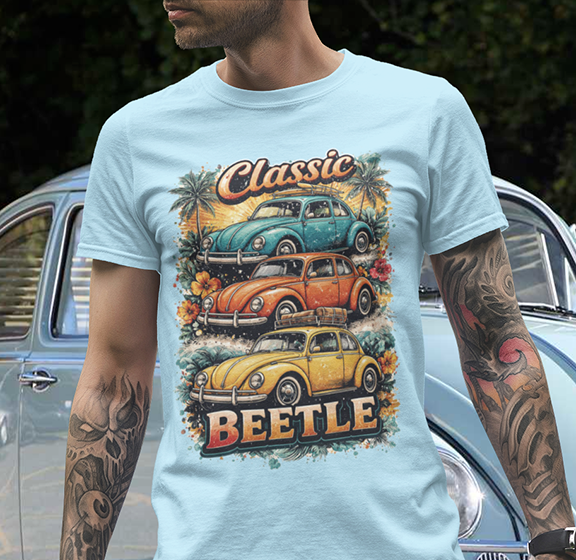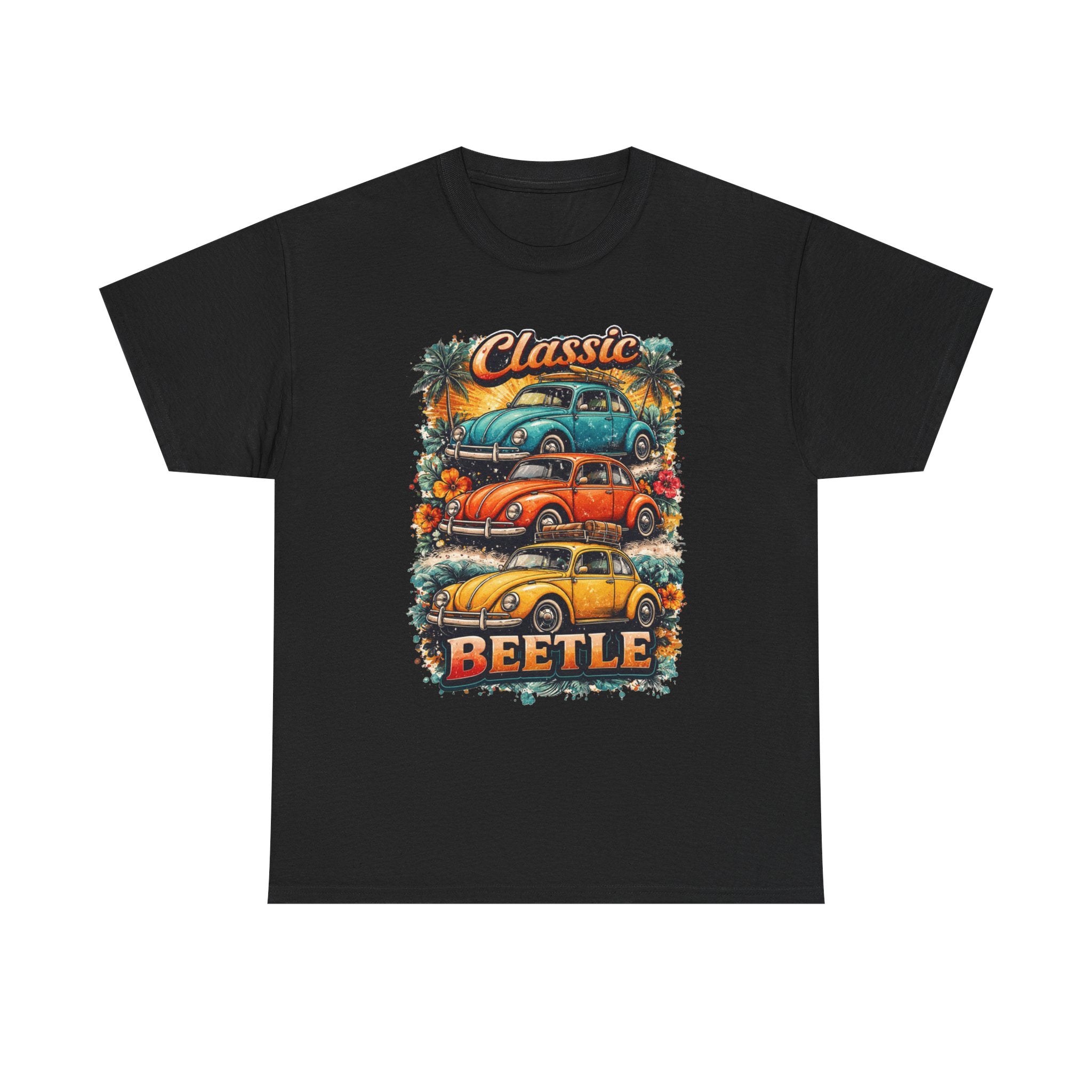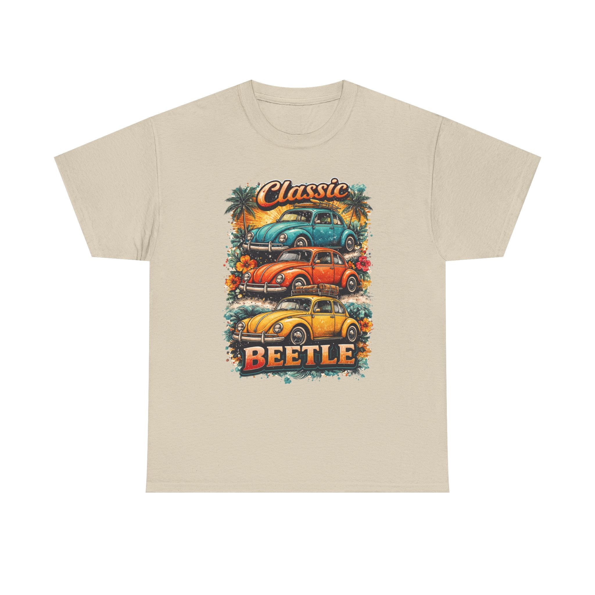 A soft, breathable tee that carries the warm nostalgia of open roads and sunlit weekends. The front art stacks three lovingly detailed classic Beetles against a sunset palette, palm silhouettes, and surf-ready vibes — like a postcard from a coastal Sunday drive. Wear it layered over a long-sleeve on cooler mornings or loose with shorts at a car meet; the relaxed crew neck and classic fit let the print take center stage while keeping you comfortable all day. Subtle natural flecks in the fabric option add a lived-in character that complements the retro illustration. This shirt feels like the comfort of an old favorite and the small thrill of finding a vintage gem at a weekend swap meet.