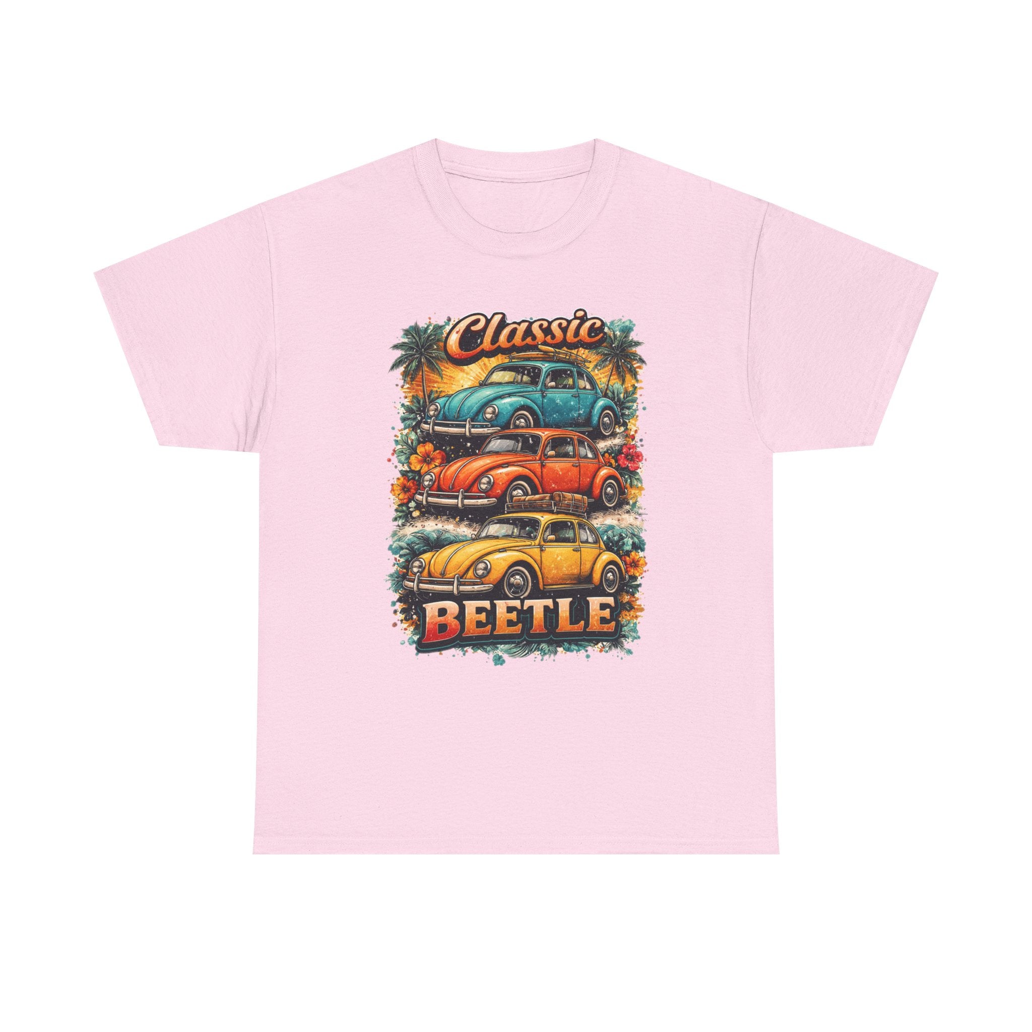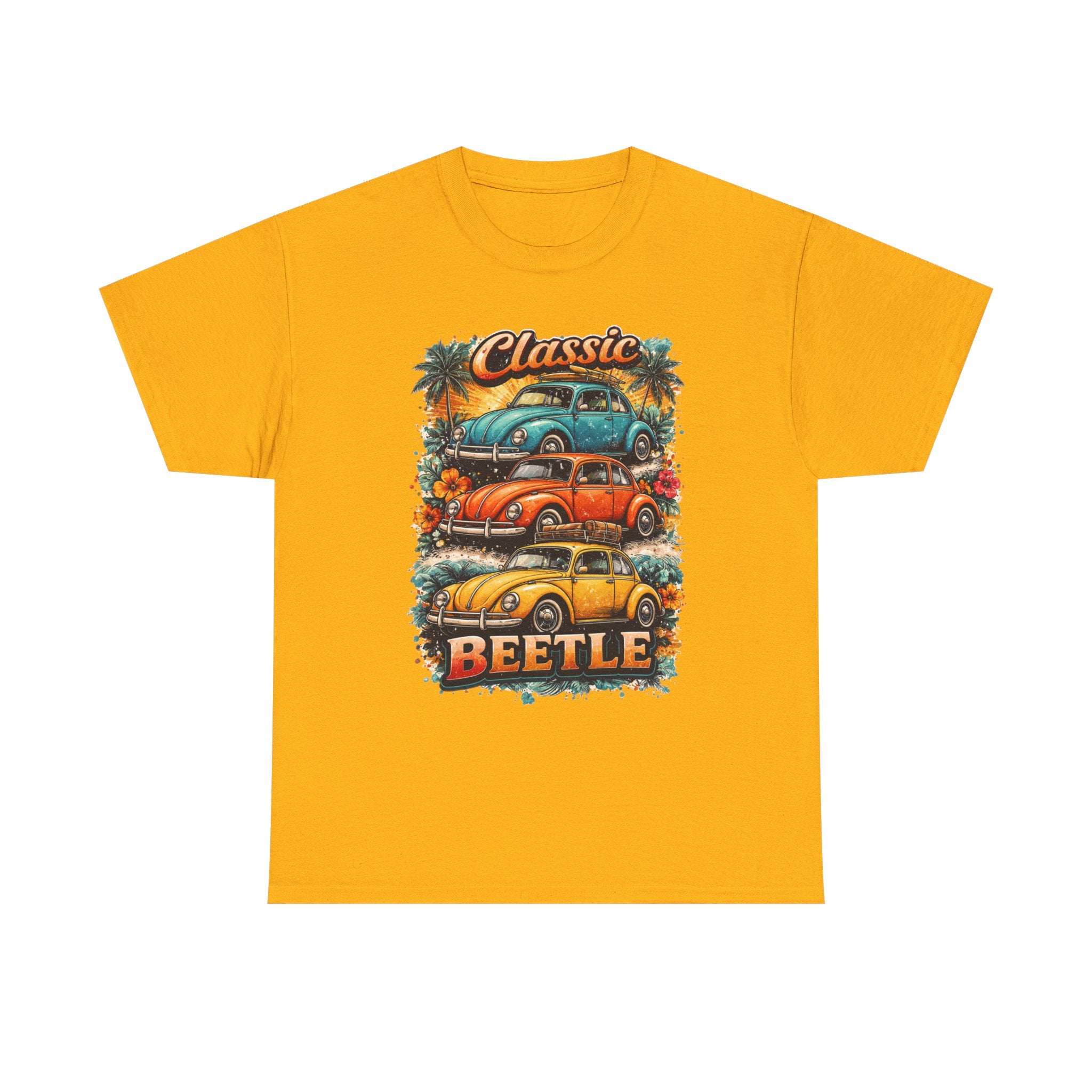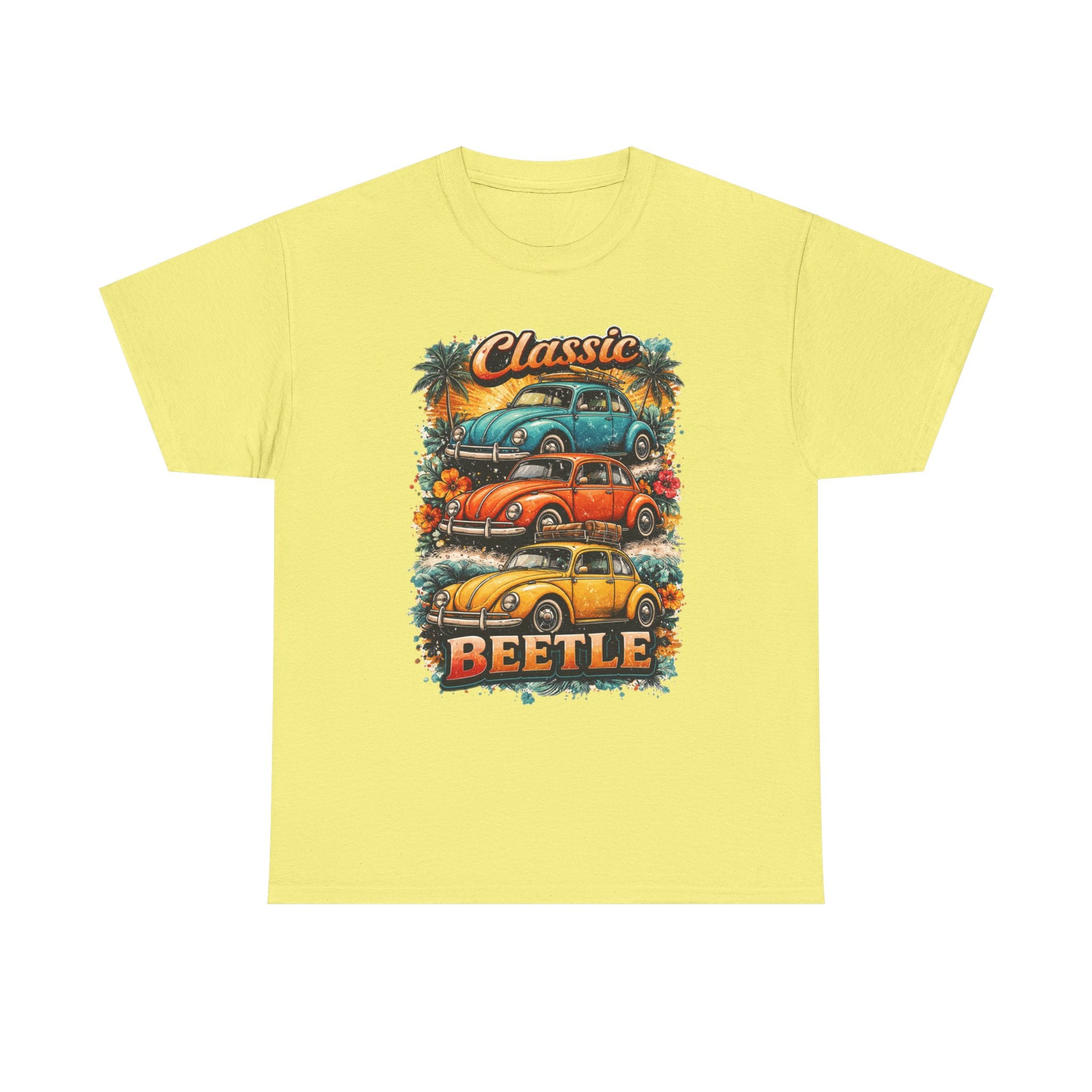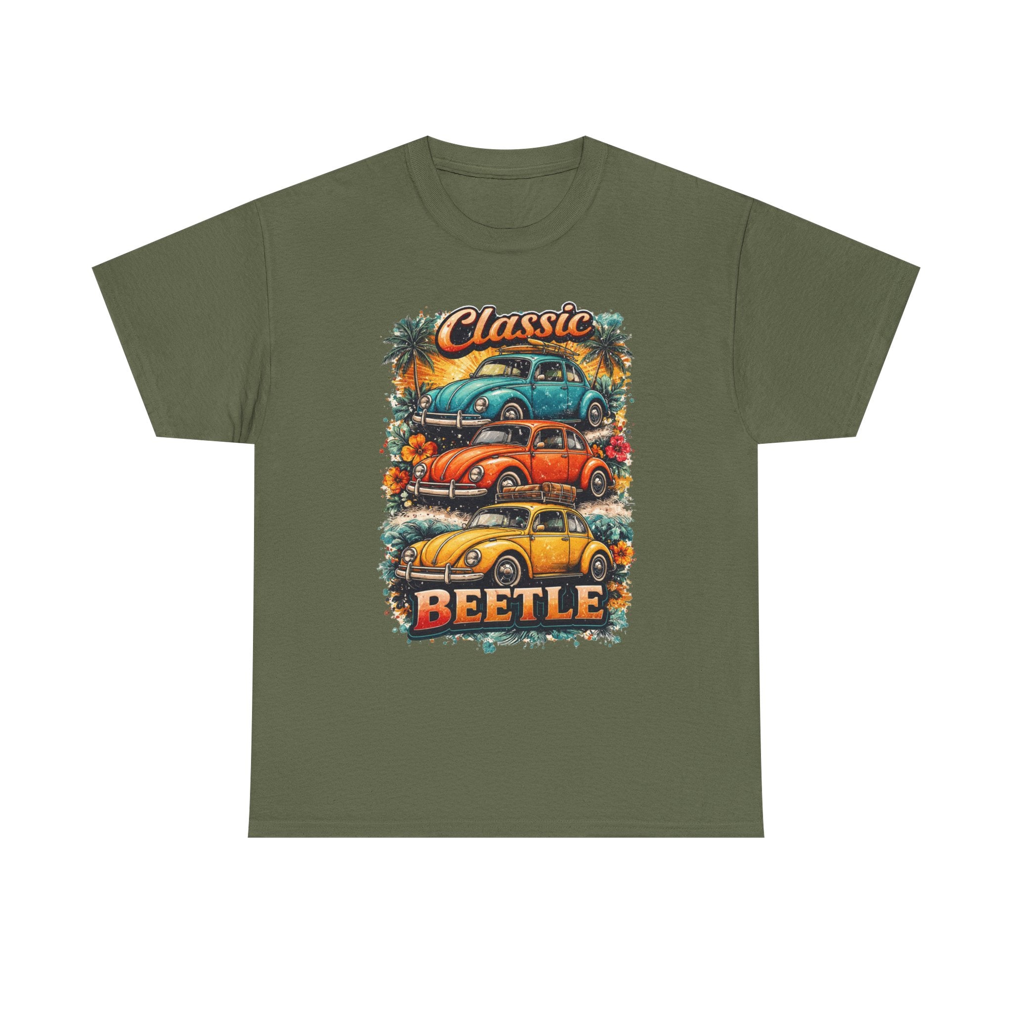 A soft, breathable tee that carries the warm nostalgia of open roads and sunlit weekends. The front art stacks three lovingly detailed classic Beetles against a sunset palette, palm silhouettes, and surf-ready vibes — like a postcard from a coastal Sunday drive. Wear it layered over a long-sleeve on cooler mornings or loose with shorts at a car meet; the relaxed crew neck and classic fit let the print take center stage while keeping you comfortable all day. Subtle natural flecks in the fabric option add a lived-in character that complements the retro illustration. This shirt feels like the comfort of an old favorite and the small thrill of finding a vintage gem at a weekend swap meet.